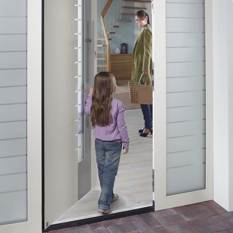 Voordeuren van Hörmann zijn zowel bovenaan, langs de zijkanten als onderaan winddicht, omdat ze standaard met een lage drempel zijn uitgerust. Ook een goede isolatie is de maatstaf in het voordeurengamma. De wereldkampioen in warmte-isolatie versterkt het arsenaal: de ThermoCarbon aluminium voordeur heeft een UD-waarde tot 0.47 W/(m2∙K). Op het gebied van veiligheid kennen Hörmann-voordeuren hun gelijke niet. De meervoudige vergrendeling en een uiterst efficiënte inbraakwerende RC-veiligheidsuitrustig zorgen voor een gevoel van geborgenheid.